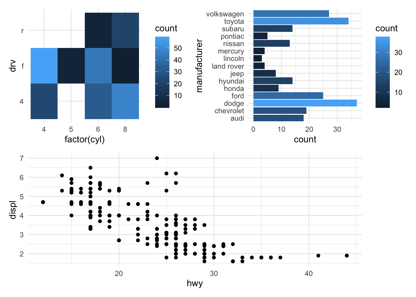 geom_tile(aes(factor(cyl), drv, fill = stat(count)), stat = 'bin2d')